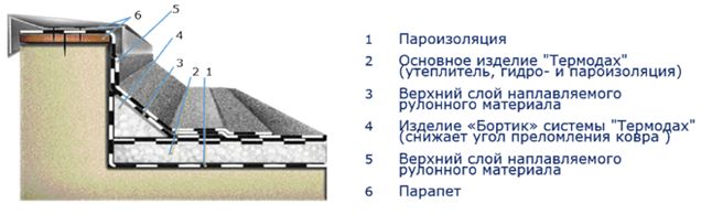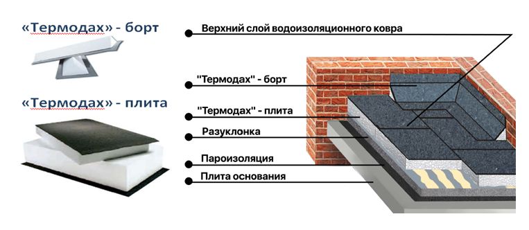 Система «Термодах» состоит из изделий на основе плитного утеплителя (пенополистирола в том числе и экструзионного, минеральной ваты и пенополиуретана) с наклеенным в заводских условиях слоем рулонного материала и верхнего слоя из рулонного битумно-полимерного покрытия на основе из полиэстера, стекловолокна или полиэфиров, который укладывается непосредственно на объекте.