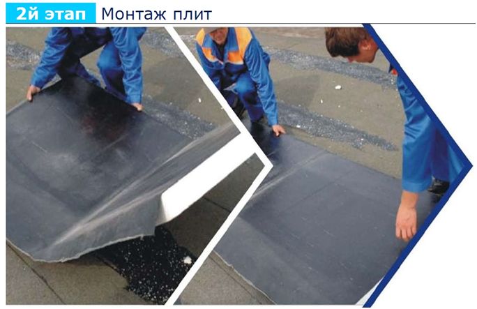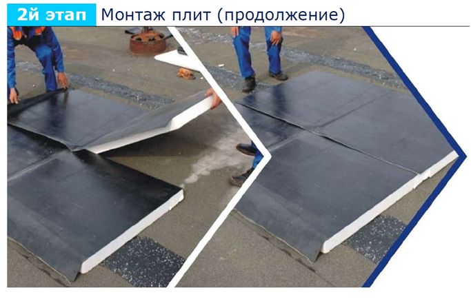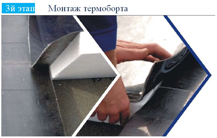 Плиты «Термодах» крепятся полиуретановым клеем либо специальными мастиками к основанию. Нахлесты рулонного материала плит «Термодах» припаиваются с помощью горелки, что создает сплошной нижний гидроизоляционный слой. В качестве верхнего слоя укладывается рулонный наплавляемый материал с посыпкой. Для повышения гидроустойчивости кровли, применяются специальные угловые элементы «Термодах» борт.
